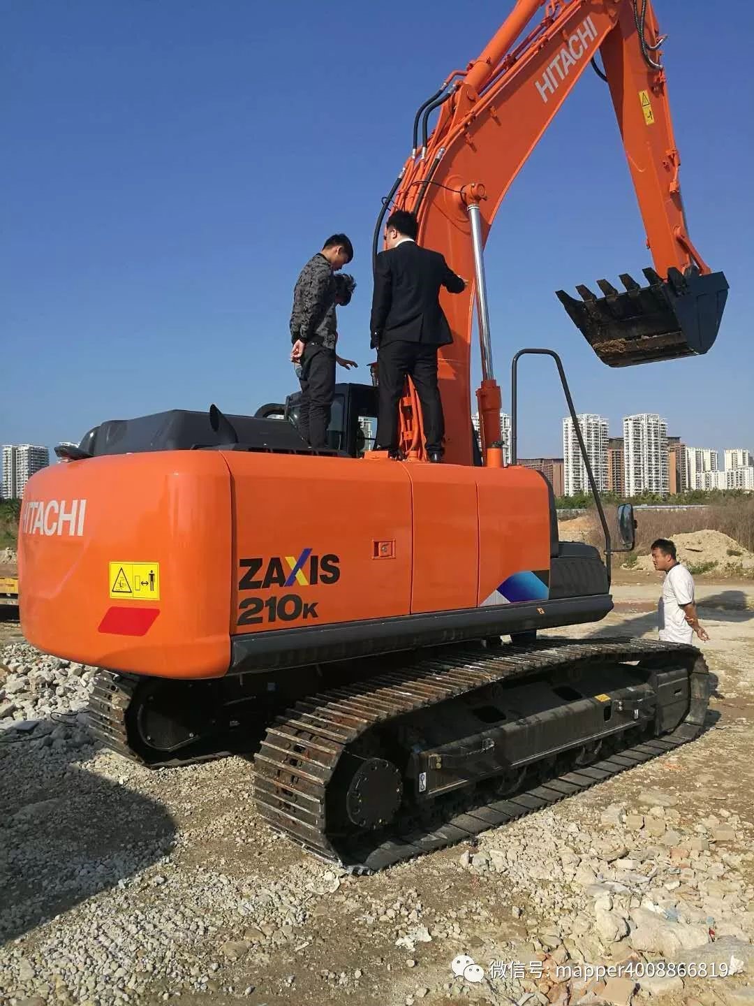在展會開始之前,由趙兵總監(jiān)及日立都業(yè)圣先生在機器擺放場地,實地為客戶講解日立再生認(rèn)證機及ZX210K-5A新機。