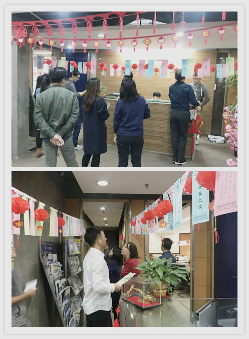 總公司前臺(tái)、會(huì)議室、辦公室走廊等掛滿了喜氣洋洋的紅燈籠以及400道彩色燈謎條。來(lái)自美鵬的高手們爭(zhēng)相競(jìng)技,猜謎博弈,現(xiàn)場(chǎng)不時(shí)傳來(lái)陣陣笑語(yǔ)。